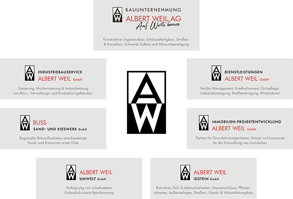 In den letzten Jahren hat sich unser Unternehmen dynamisch weiterentwickelt. Neben der Bauunternehmung Albert Weil AG gehören heute die Tochtergesellschaften Dienstleistungen Albert Weil GmbH, Immobilien-Projektentwicklung Albert Weil GmbH, Industriebauservice Albert Weil GmbH, BUSS Sand- und Kieswerk GmbH, Albert Weil Umwelt GmbH und Albert Weil Idstein GmbH zur Unternehmensgruppe Albert Weil. Dennoch sind und bleiben wir Bauunternehmung.